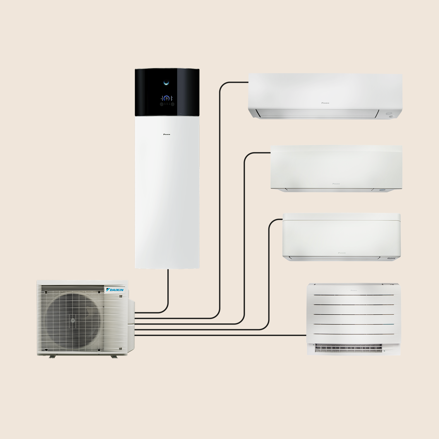 Vytápění a chlazení vašeho domova a ohřev vody propojením jedné venkovní jednotky až se čtyřmi vnitřními jednotkami a zásobníkem teplé vody.
