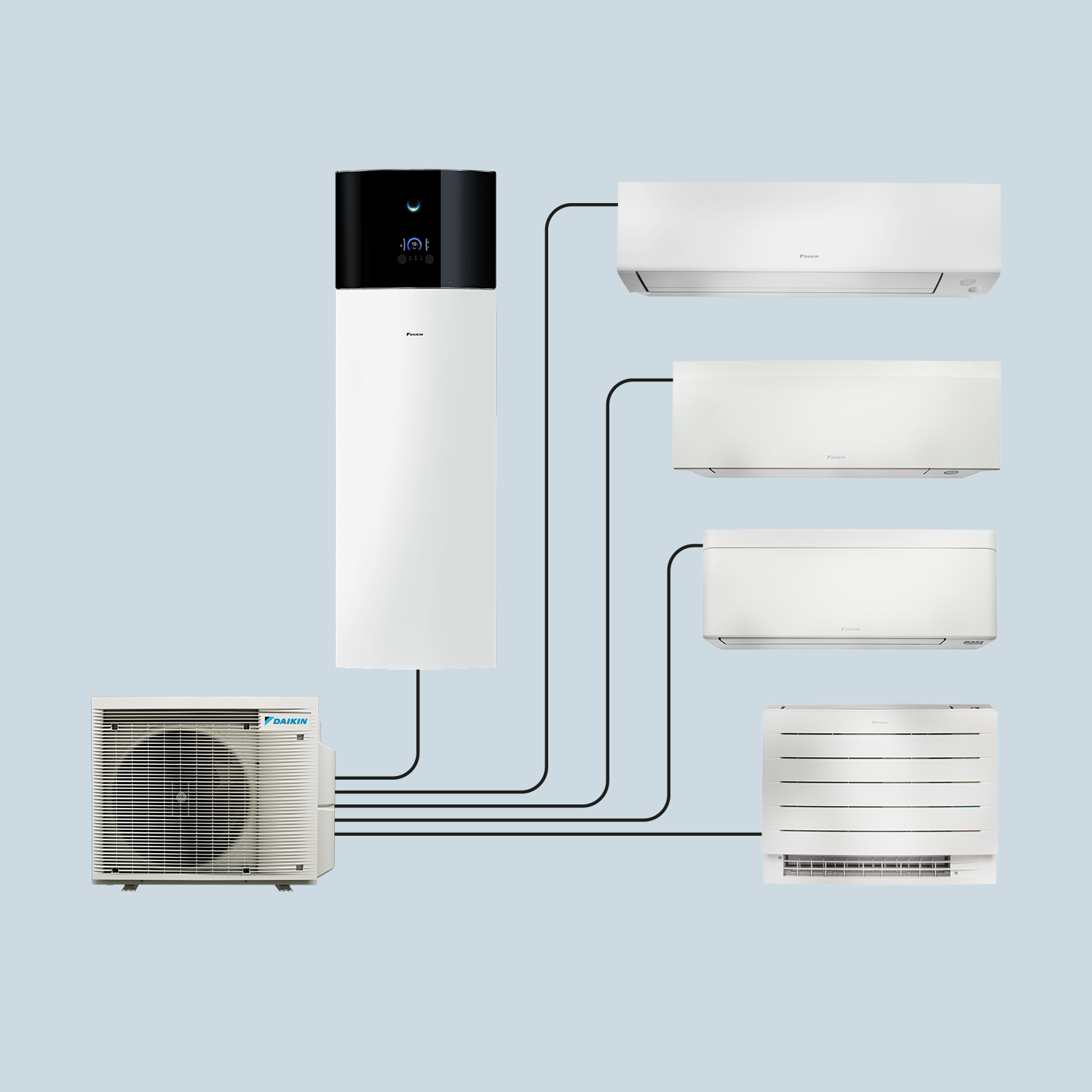 Vytápění a chlazení vašeho domova a ohřev vody propojením jedné venkovní jednotky až se čtyřmi vnitřními jednotkami a zásobníkem teplé vody.